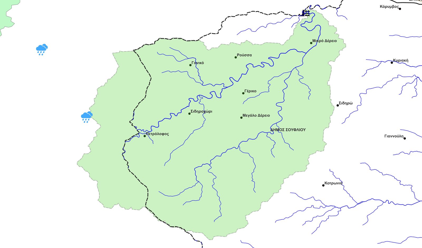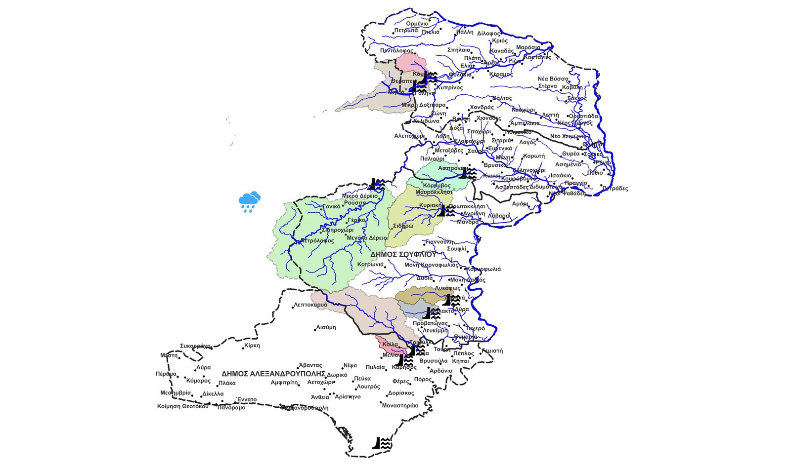 Εικόνα 1. Η απεικόνιση της «λεκάνης απορροής» (έως την θέση στην οποία πρόκειται να κατασκευαστεί το«Φράγμα Μ. Δερείου»), του αντίστοιχου «υδρογραφικού (γραμμικού) δικτύου» της θέσης του προαναφερθέντος φράγματος (σύμβολο «φράγμα με νερό εκατέρωθεν των πλευρών του» με «μαύρη» απόχρωση) και των μετεωρολογικών σταθμών της «Βυρσίνης, Δήμου Αρριανών, Π.Ε. Ροδόπης» και του «Κέχρου, Δήμου Αρριανών, Π.Ε. Ροδόπης»,, (σύμβολα «σύννεφο με βροχή» με «γαλάζια» απόχρωση, το όριο μεταξύ του «Δήμου Σουφλίου» και του «Δήμου Διδυμοτείχου» της «Π.Ε. Έβρου» (διακεκομμένη γραμμής με «μαύρη» απόχρωση)