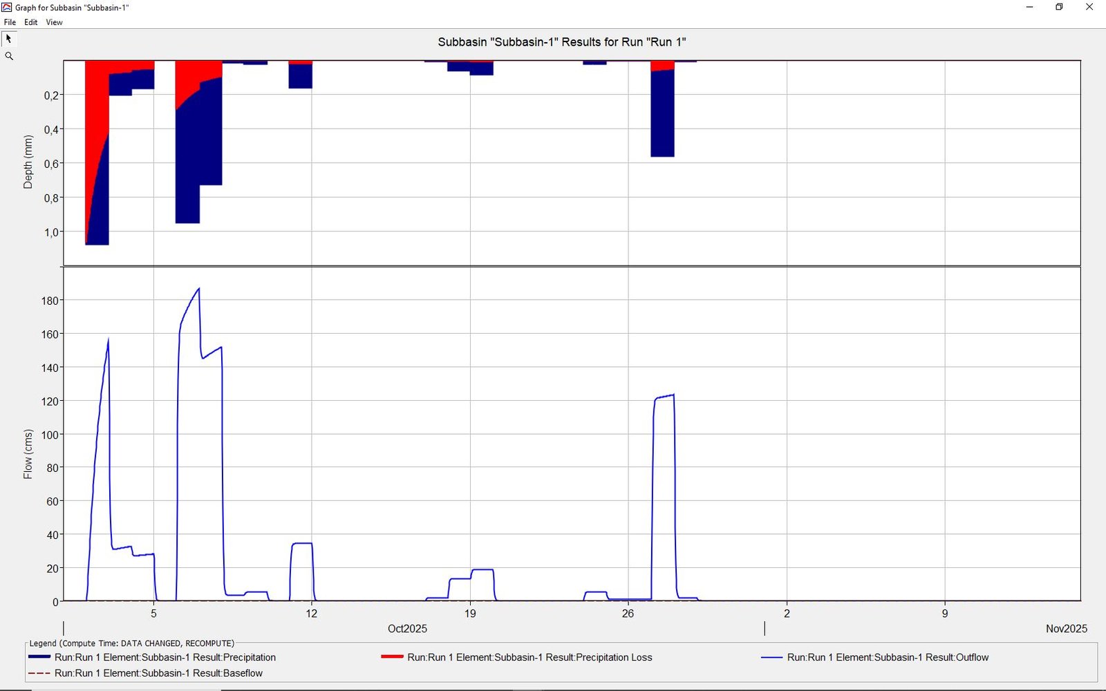 Επιπλέον, στην παρακάτω εικόνα απεικονίζεται το, «διάγραμμα / ιστόγραμμα βροχόπτωσης / απορροής», που αφορά το «Φράγμα Μ. Δερείου, Σουφλίου, (“Ποταμός Ερυθροπόταμος”)», του χρονικού διαστήματος, “01-31/10/2025” (“196,20 mm”), (το οποίο και «απέδωσε» την, παροχή αιχμής νερού και συγκεκριμένα «122,80 κυβικά μέτρα ανά δευτερόλεπτο» ή αλλιώς «122,80 m3/sec»), [το οποίο και «απέδωσε», λόγω της συνολικής, αθροιστικής, βροχόπτωσης του μήνα «Οκτώβρη 2025», την συνολική ποσότητα νερού, «59.549.400 κυβικά μέτρα (τόνους) νερού» ή αλλιώς «59.549.400 m3 (τόνους) νερού»], (η ανάλυση και οι υπολογισμοί έγιναν με το ελεύθερο στο διαδίκτυο λογισμικό «HEC–HMS» του «U.S.A. Army Corps of Engineers» δηλαδή του «Σώματος Μηχανικών του Στρατού των Η.Π.Α.»).