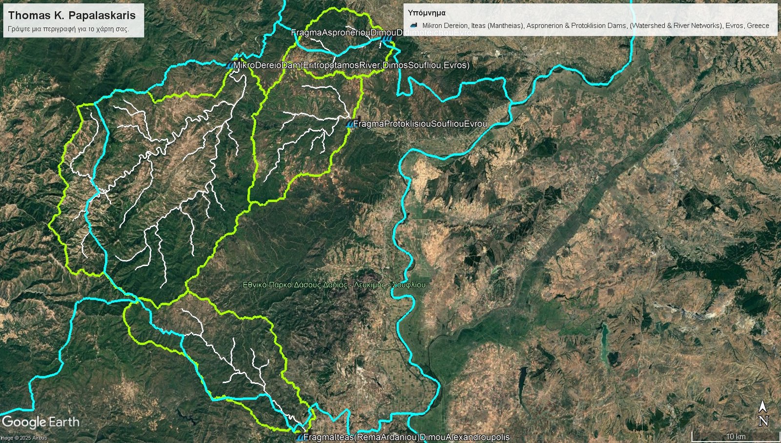 Εικόνα 3. Η απεικόνιση της λεκάνης απορροής, [εξωτερικό περίγραμμα με «ανοιχτή πράσινη» απόχρωση, πουαντιστοιχεί έως την θέση όπου πρόκειται να κατασκευαστεί, το «Φράγμα Μ. Δερείου», της «Περιφερειακής Ενότητας (Π.Ε.) Έβρου»] και του (πλήρως ανεπτυγμένου) αντίστοιχου, περιεχόμενου σε αυτήν, υδρογραφικού δικτύου (γραμμές με «άσπρη» απόχρωση), της προαναφερθείσας λεκάνης απορροής επί του υπόβαθρου της διαδικτυακής πλατφόρμας «Google Earth».