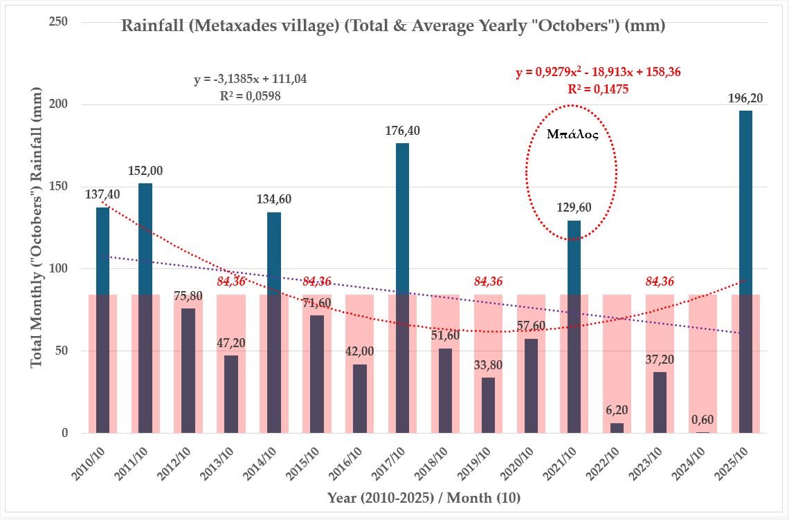 Επιπλέον, στην παρακάτω εικόνα απεικονίζεται το, «διάγραμμα / ιστόγραμμα βροχόπτωσης» (τύπου «θερμομέτρου»), που αφορά τις συνολικές αθροιστικές βροχοπτώσεις για τον μήνα «Οκτώβρη 2010-2025», του μετεωρολογικού σταθμού των «Μεταξάδων, Δήμου Διδυμοτείχου, Π.Ε. Έβρου», όπου φαίνεται ότι ο μήνας «Οκτώβρης 2025» («196,20 mm») είναι «ο πρώτος (1ος) (μεγαλύτερος) στην κατάταξη των τελευταίων δεκαέξι (16) ετών». Επί πλέον φαίνεται, (με κόκκινα γράμματα και πλάγια γραφή), ο μέσος όρος των ιστορικών συνολικών αθροιστικών βροχοπτώσεων, («84,36 χιλιοστά βροχόπτωσης»), για τον μήνα «Οκτώβρη 2010-2025». Κατά συνέπεια υπάρχει αισιοδοξία όσον αφορά τις μελλοντικές βροχοπτώσεις.